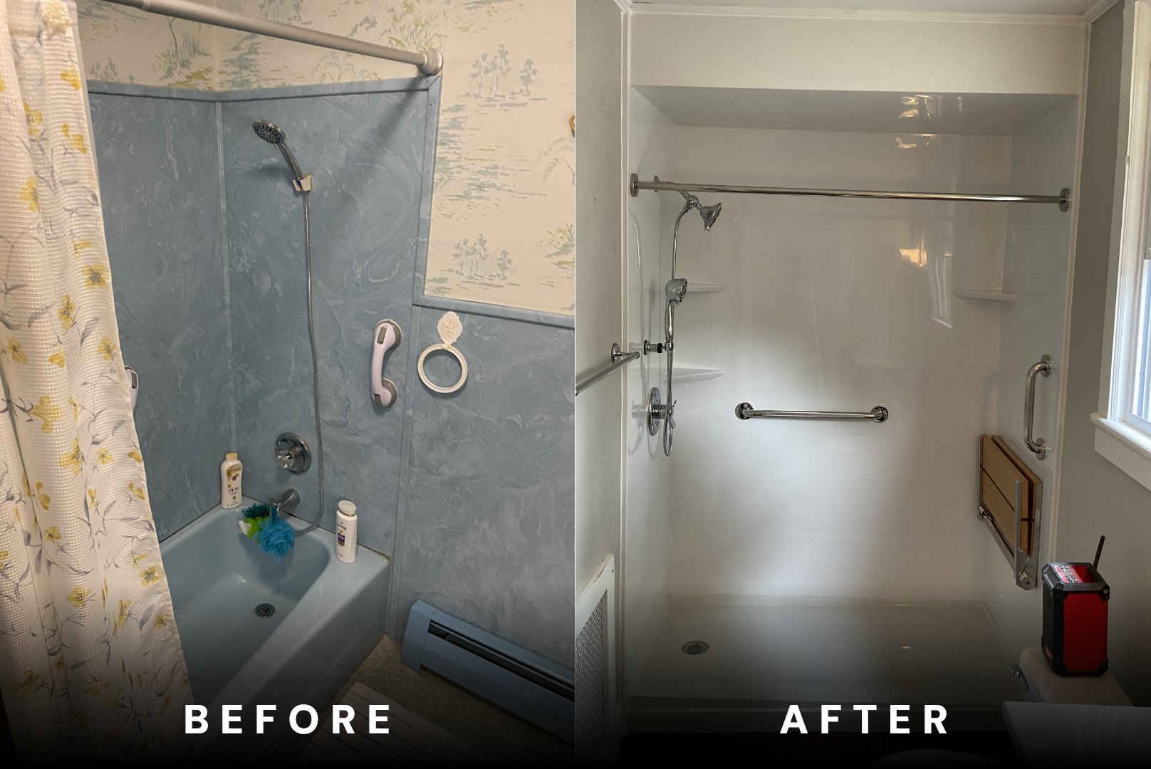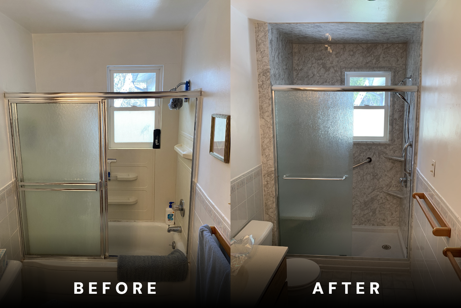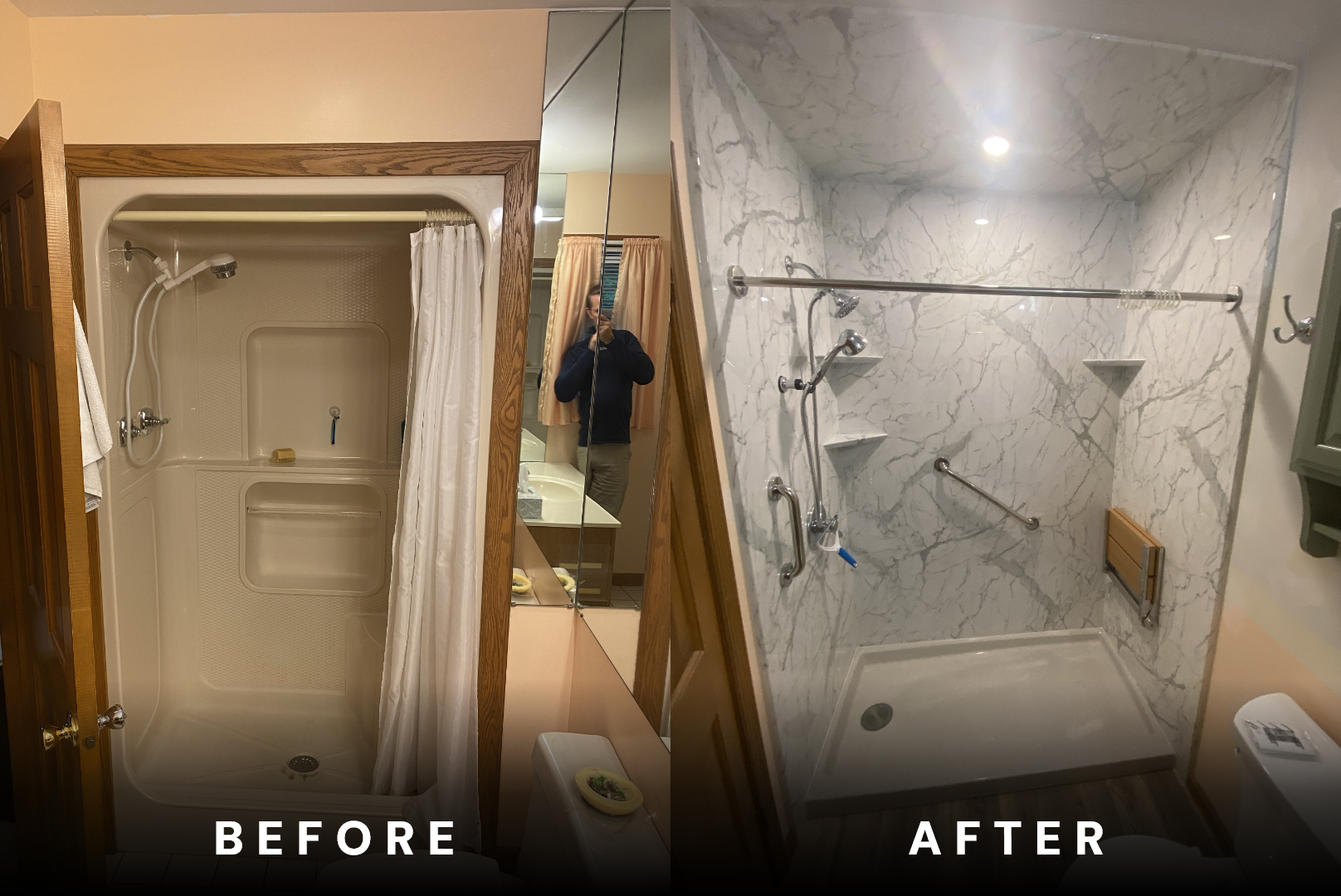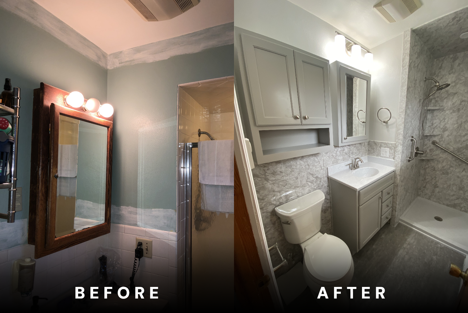 before and after photo of a bathroom vanity, mirrors, and lighting